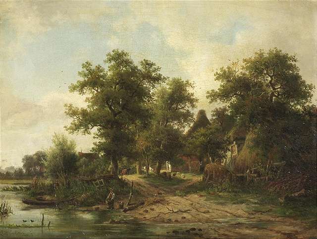 Summery landscape with a farmstead at a river.