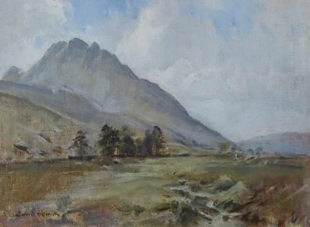 mountainous landscape scene with a rocky stream and trees in the foreground