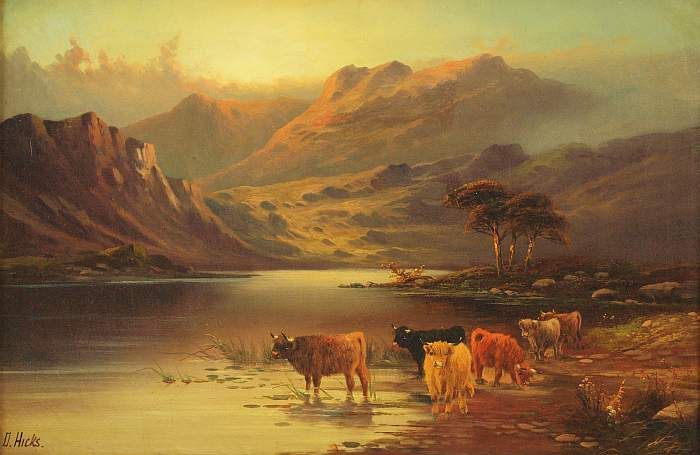 Herde schottischer Hochlandrinder am Gebirgssee