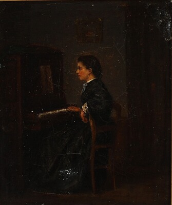 Interior with a woman sitting at the piano