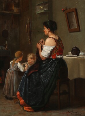 | Italian interior with a mother sewing and her children playing next to her | |