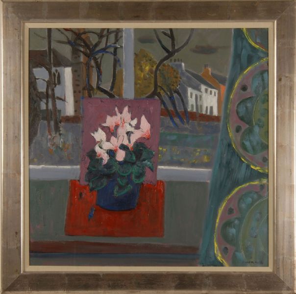 Cyclamen in the Village", a still life of flowers in a window with distant houses.