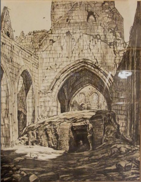 First World War drawing of bunker within ruined church - Church at Bapaume