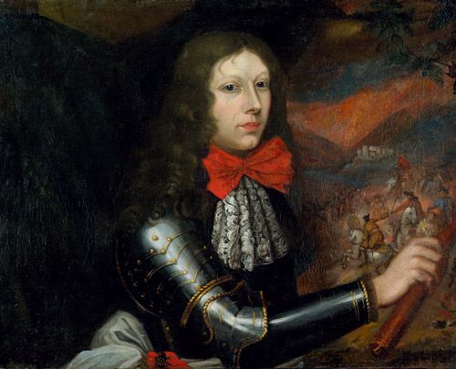 | Prinz Eugen als Feldherr, im Hintergrund ein Schlachtgetümmel | |