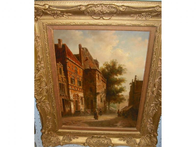 Dutch market town with figures on a cobbled street