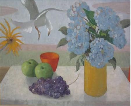 STILL LIFE WITH HYDRANGEAS AND SEAGULL