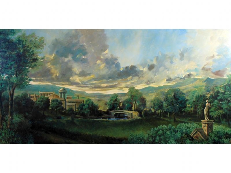 | Romantic Italian landscape with river, bridge, Roman buildings and temple | |