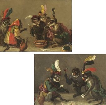 Monkeys smoking and drinking; and Monkeys drinking and playing cards