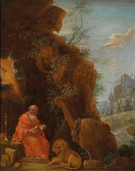 Saint Jerome and the lion outside a rock cave