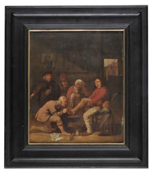 | A surgeon tending to a patient’s foot in an interior, oil on panel, depicting a surgeon kneeling whilst operating on his patient | |