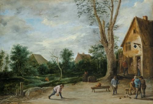| A VILLAGE SCENE WITH FOUR PEASANTS PLAYING BOWLS BEFORE A TAVERN, TWO COTTAGES BEYOND | |