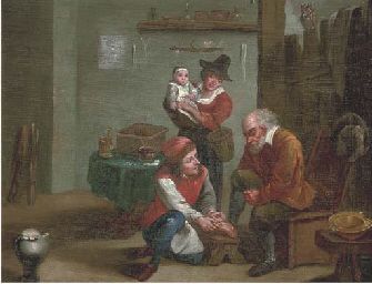 | A chiropodist treating a man's foot with a peasant woman and a baby watching | |