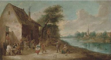 | A river landscape with peasants drinking and merrymaking outisde a tavern | |