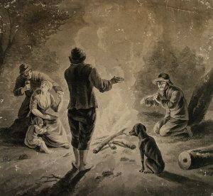 Figures gathered around a fire