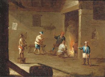 | Figures in an interior smoking and drinking by a fire, with another figure playing the doodle-sack | |