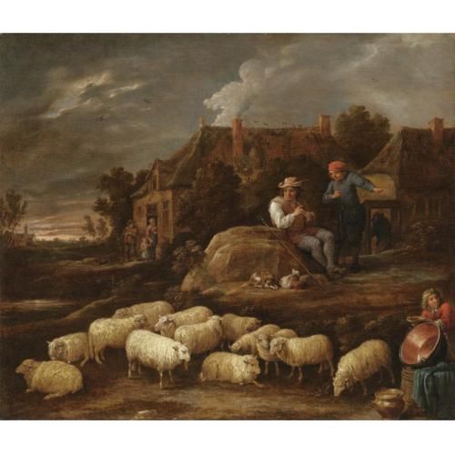 A PASTORAL VILLAGE LANDSCAPE WITH A SHEPHERD RESTING HIS FLOCK, A BOY COLLECTING WATER IN THE FOREGROUND