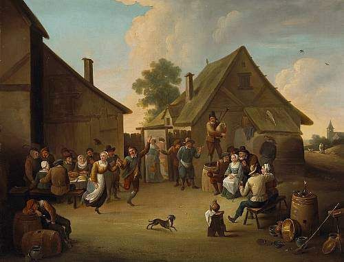 Villagers dancing and frolicking outside an inn