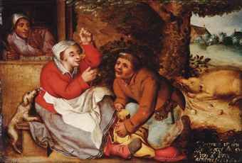 | A peasant couple together with a pig and a dog near a house with a spinster in a door opening | |
