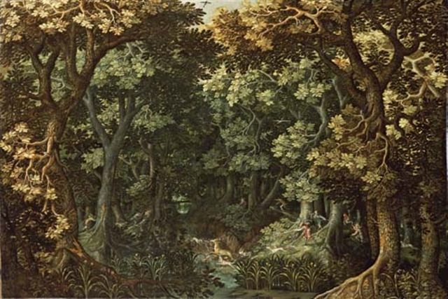 A wooded river landscape with a stag hunt