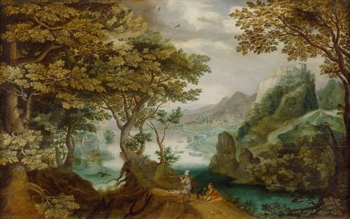 Waldige Flusslandschaft mit Blick auf eine Stad...