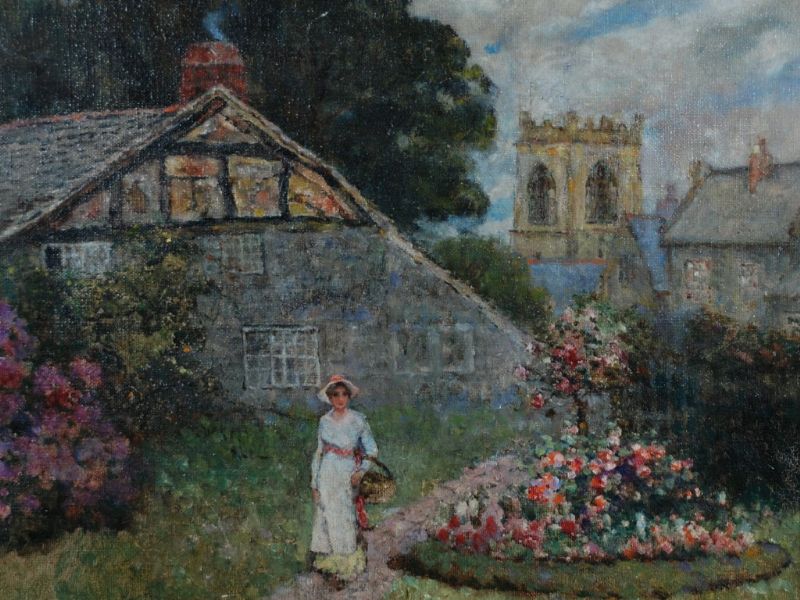 | A village scene with a lady passing a flower border, cottages and church tower beyond | |