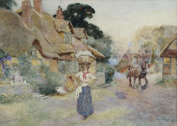 | Village scene with young woman carrying basket of washing, and ploughman on a horse, | |