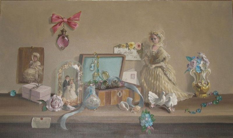 A still life of dolls and ornaments on a ledge