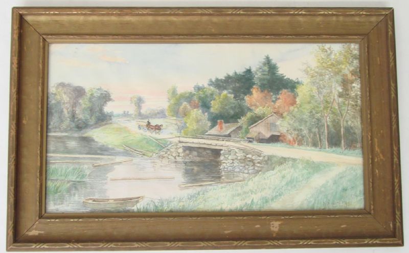 Fall landscape with man in a horse-drawn carriage crossing a bridge