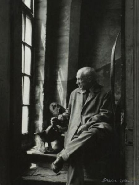 | PABLO PICASSO DANS SON ATELIER RUE DES GRANDS AUGUSTINS,AVEC SES STATUES DE CHOUETTES | |