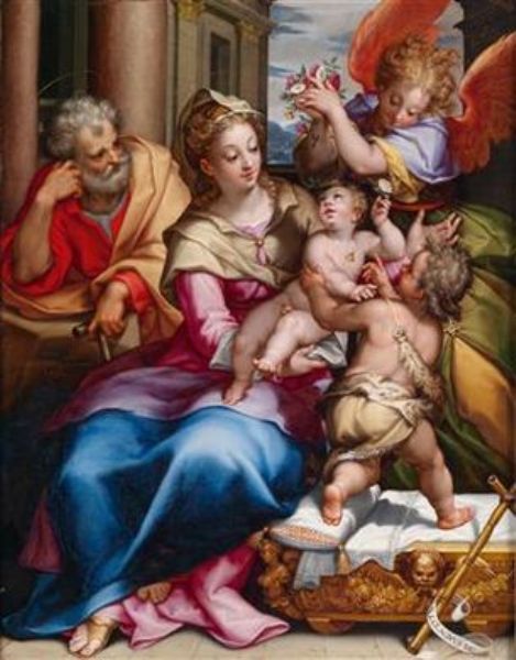 | The Holy Family and the Infant Saint John the Baptist with an angel and flowers | |