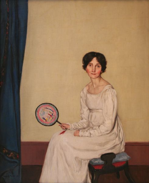 | Three-quarter Length Portrait of a Lady wearing a White Dress and holding a Fan within an Interior | |