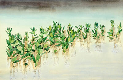 Lay figure composition with leaves