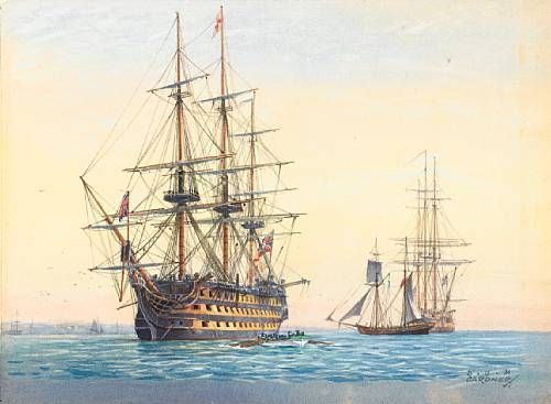 | Lord Nelson being rowed out to join Victory lying at anchor off the Isle of Wight, with the frigate Euryalus moored astern, 14th | |