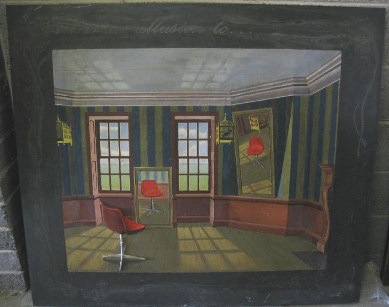 | Surreal room study of a bird in a cage, an office chair in relief, reflected in a mirror leaning against a wall, | |