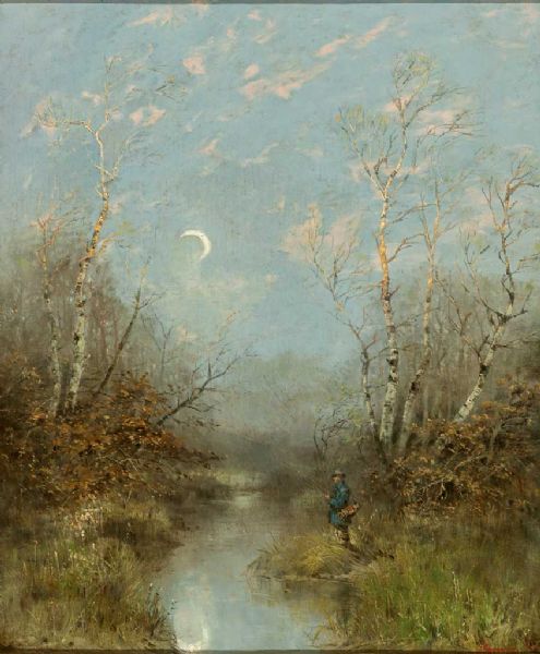 An einem von Birken besetzten Ufer steht ein Fischer bei Mondlicht