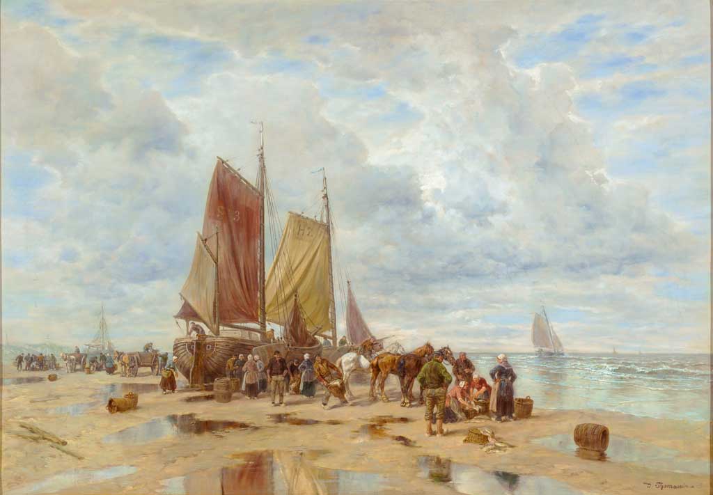 Uferstück mit anlandenden Fischerbooten und lebhaftem Treiben am Strand