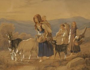 Junge italienische Bäuerin mit Kindern und Ziegen