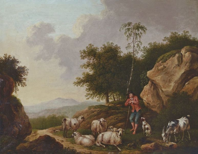 Schäfer mit Herde in felsiger Landschaft