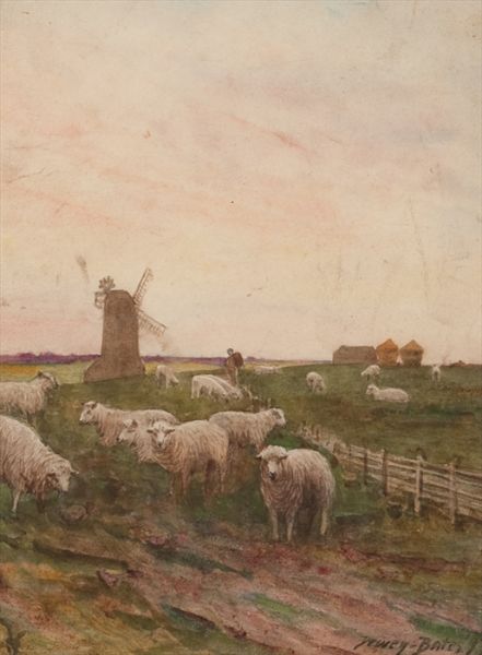 SHEEP GRAZING BY A MILL