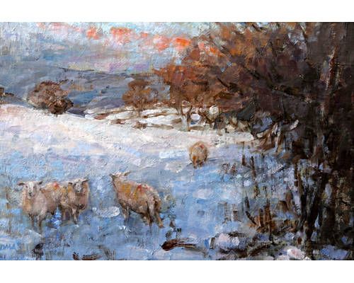 Burnished by the setting sun, sheep in the snow', Bala