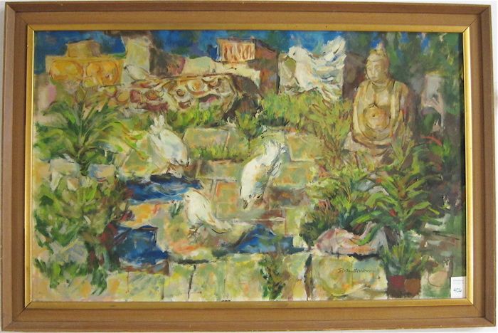 | A high horizon painterly courtyard scene with Asian inspiration and birds | |