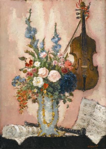 STILL LIFE WITH VASE OF FLOWERS, VIOLIN AND OBOE