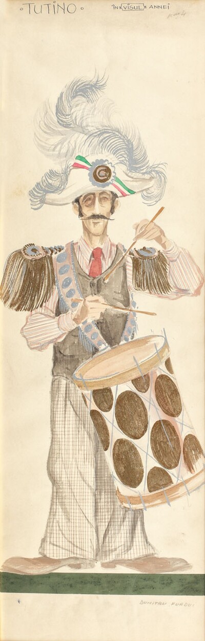 | Schiţă de costum pentru personajul Tutino, spectacolul "Emigrantul din Brisbane" de Georges Schehade, decor Liviu Ciulei, regia | |