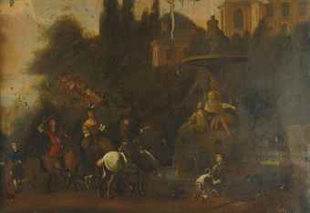 A hawking party at rest before an Italiante fountain