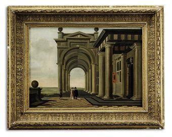 | An architectural capriccio with figures and a dog, a landscape beyond | |