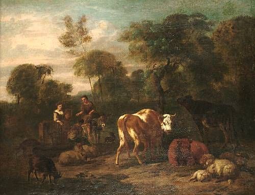 | A young woman and two shepherds beside a well, goats, sheep and cattle nearby | |