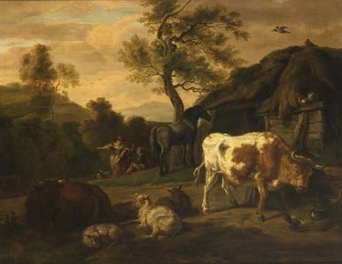 CATTLE NEAR A FARMSTEAD, TWO SHEPHERDS BEYOND