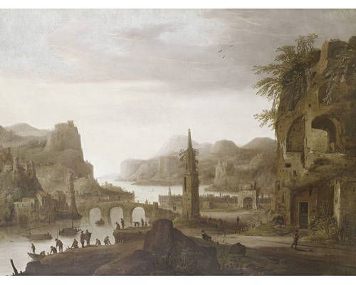 | Travellers beneath a ruined building and fishermen on a shore before an extensive coastal landscape, a village and a harbour in | |