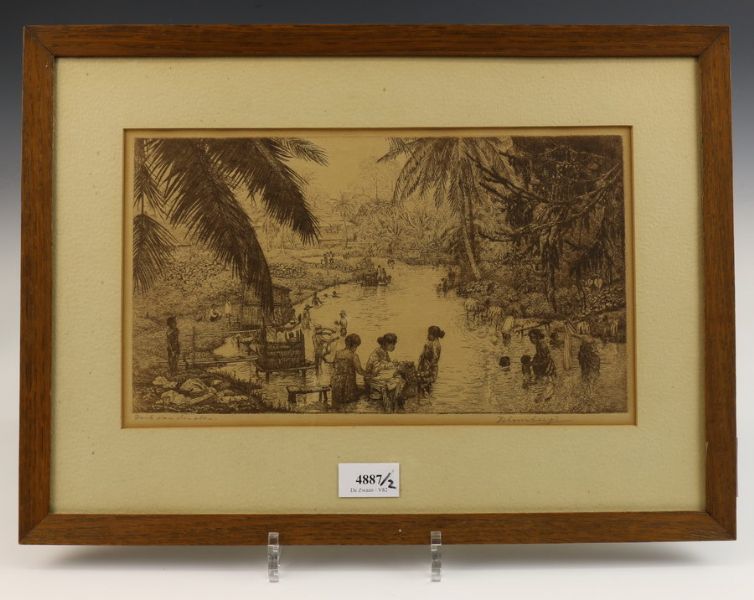 Twee gezichten op een rivier met badende mensen, Indonesië