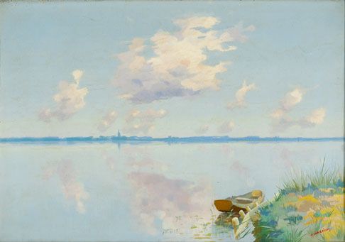 | Plasgezicht met een roeiboot en aan de horizon een kerktoren | |